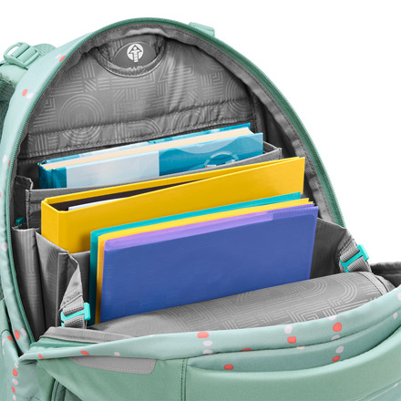 - Zwei großzügige Hauptfächer mit integriertem Bücherbereich und herausnehmbarem Innenorganizer,